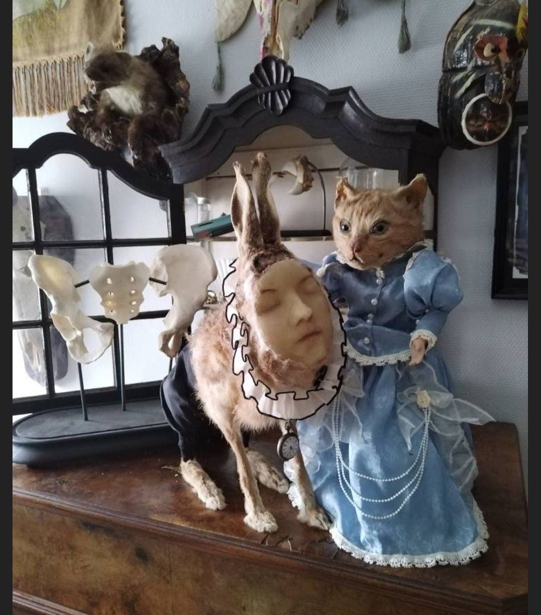 Véritable lièvre naturalisé avec visage en cire humain ancien, pièce unique et étrange parfait pour cabinet de curiosités
